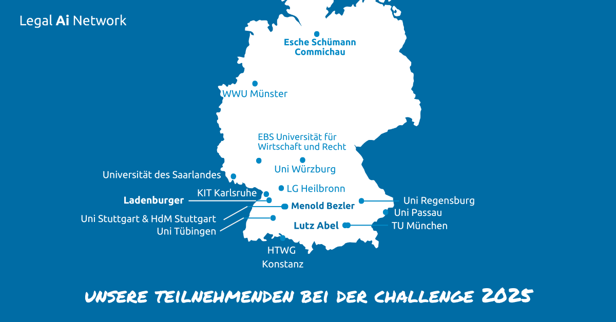An genau solchen Lösungen arbeiten die interdisziplinären Teams im Rahmen der Legal Innovation Challenge. Hier auf dieser Plattform werden durch die gezielte Einbindung und Kollaboration vielfältiger Akteure (Kanzleien, Rechtsabteilungen, Hochschulen, u.v.m.) innovative Lösungen für unsere Vision gestaltet: